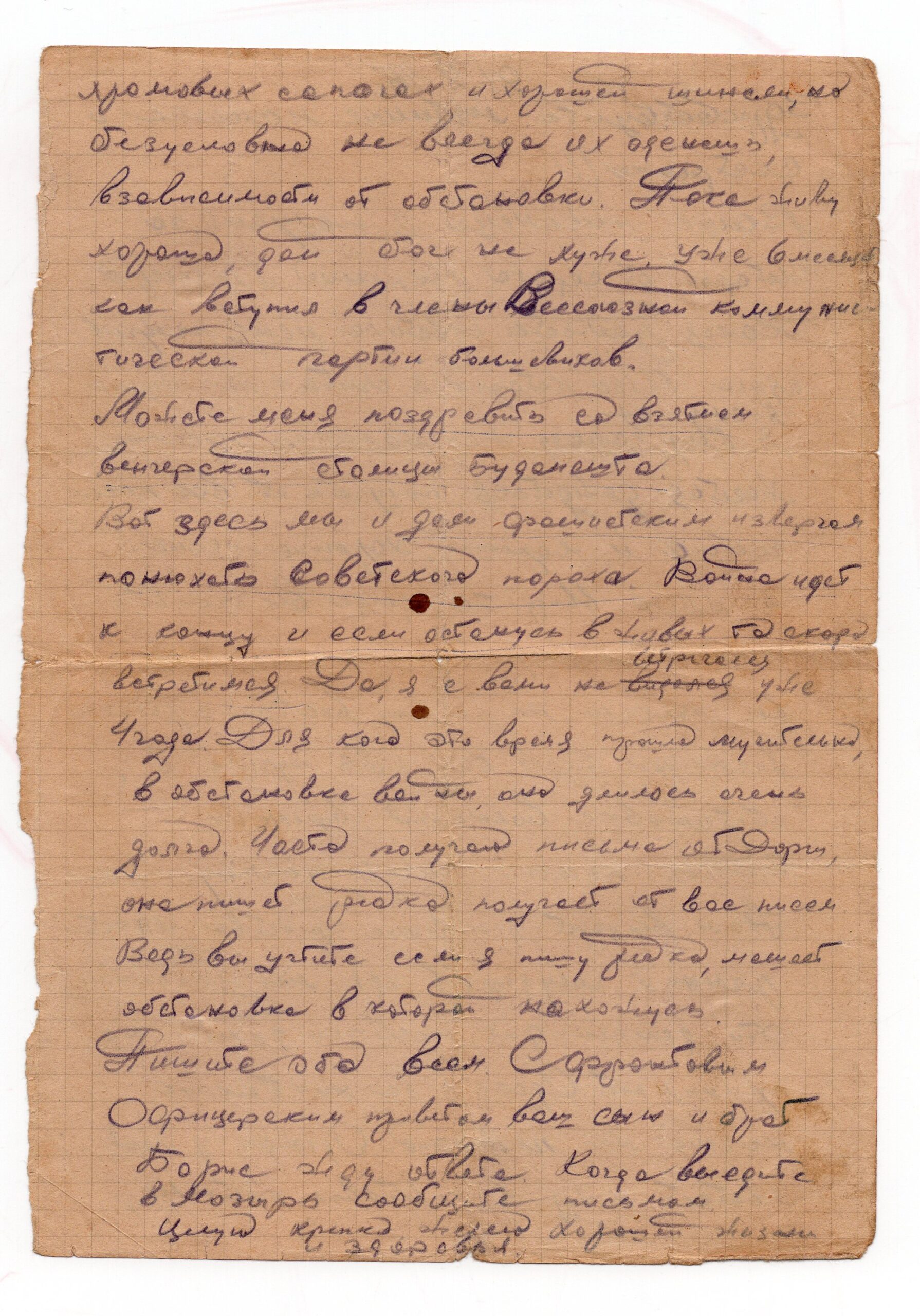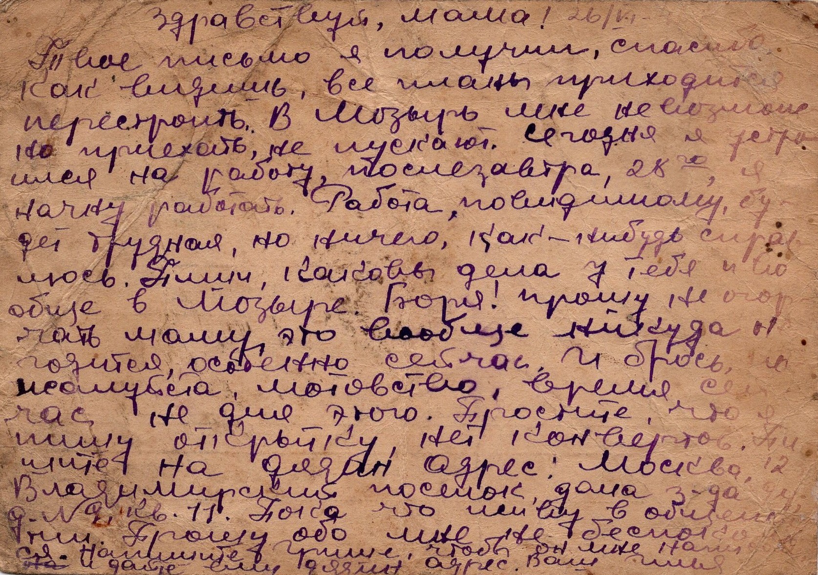 Как видишь, все планы приходится перестроить. В Мозырь мне не возможно приехать, не пускают. Сегодня я устроился на работу, послезавтра, 28го, я начну работать. Работа, по видимому будет трудная, но ничего, как-нибудь справлюсь. Пиши, каковы дела у тебя и вообще в Мозыре. Боря! Прошу не огорчать маму, это вообще никуда не годится, особенно сейчас, и брось, ?, мотовство, время сейчас не для этого. Простите, что я пишу открытку, нет конвертов. Пишите на дядин адрес: Москва, 12 Владимирский поселок, дома 3-да, 94[?], д.№9, кв.11. Пока что живу в общежитии. Прошу обо мне не беспокоится. Напишите Грише, чтобы он мне написал и дайте ему дядин адрес. Ваш Илья.