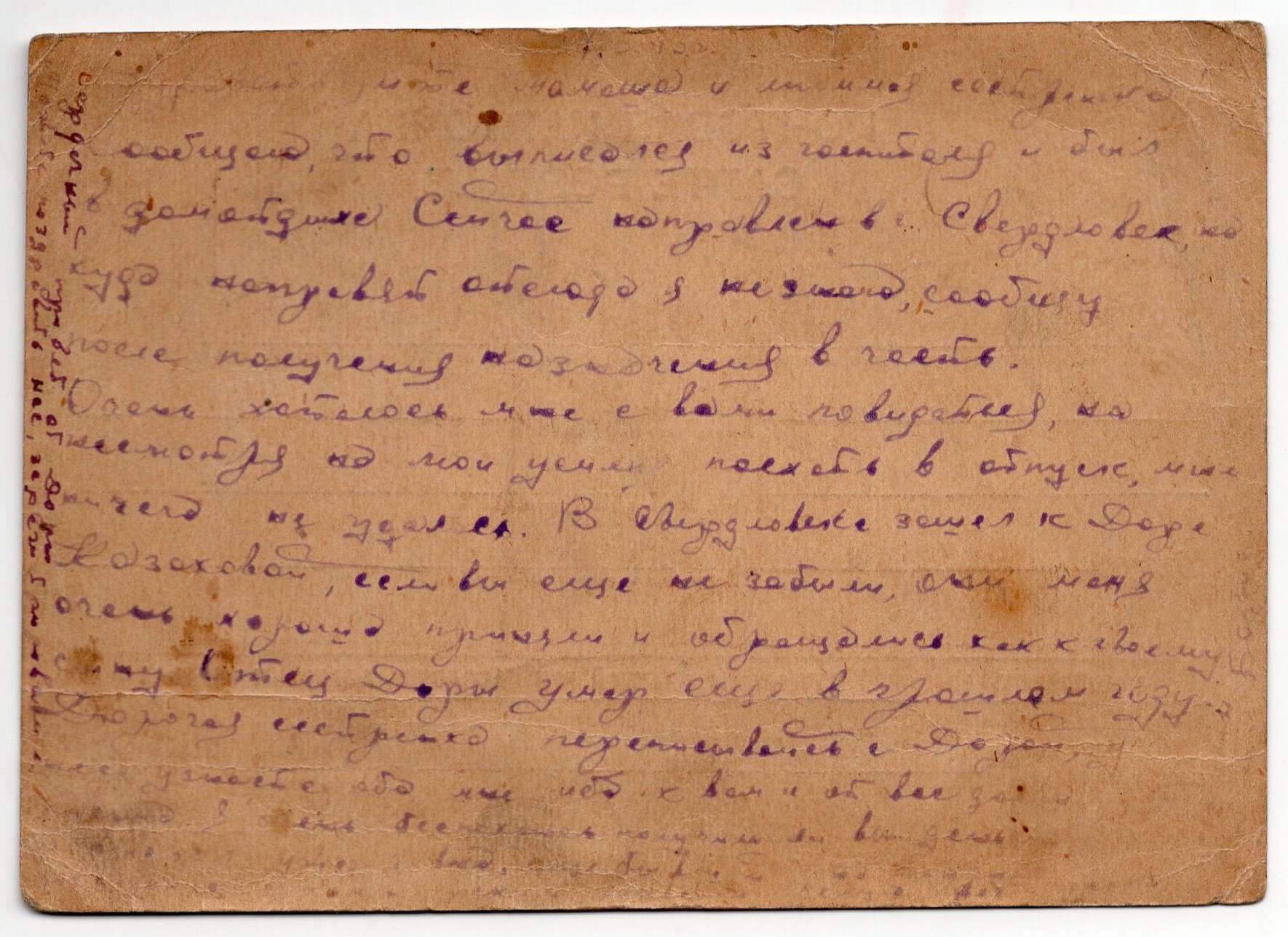 את המכתב שלך קיבלתי, תודה. כמו שאת רואה, צריך לשנות את כל התוכניות. למאזיר אין לי אפשרות להגיע, לא מאשרים להיכנס. מצאתי מקום עבודה היום, מחרתיים, ב-28, אתחיל לעבוד. העבודה, כנראה תהיה קשה, אבל לא נורא, איך שהוא אסתדר. תכתבי, מה קורה איתך ובמאזיר בכלל. בוריה! אני מבקש לא לצער את אמא, זה לא ראוי בשום אופן, במיוחד עכשיו, ועזוב, ?, פזרנות, זה לא הזמן לזה עכשיו. סלחו לי, שאני שולח גלויה, אין מעטפות. תכתבו לכתובת של הדוד [הכוונה לדוד לב פלדמן, אחי אביו של איליה]: מוסקבה, כפר ולדימירסקי 12, [איך לתרגם?], 94[?], בית מס' 9, דירה 11. בינתיים אני גר במגורים משותפים. מבקש לא לדאוג לי.