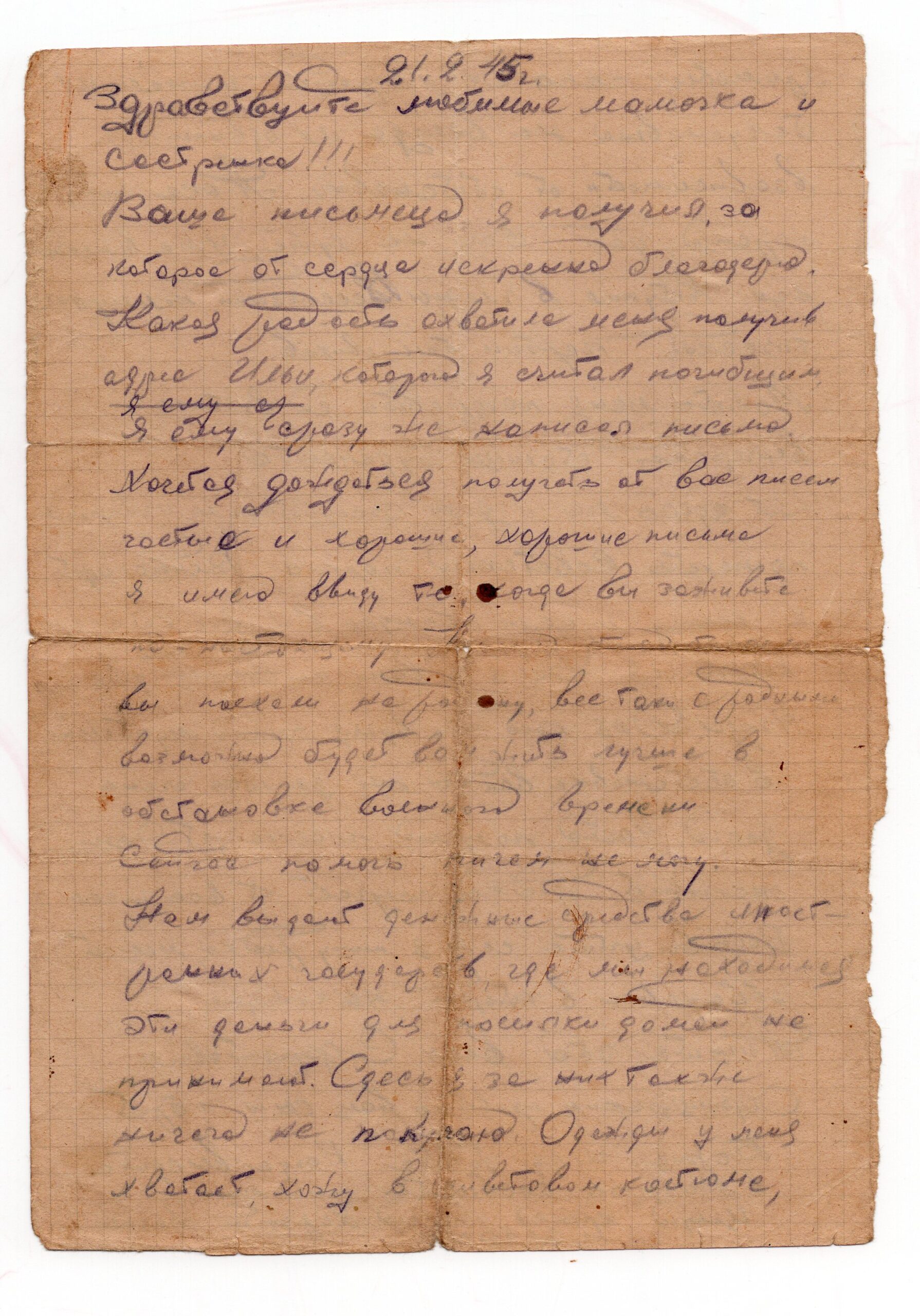 Прошу в моей просьбе не отказать, т.к. я не имею никаких сведений о своих родственниках с начала войны. Сам я кончил в Мозыре 7-ю ср. Школу, затем три года учился в Москве, а с началом войны был сброшен в тыл противника в составе парашютного десанта. Сейчас я нахожусь в действующей армии. Сообщения шлите по адресу: Полевая почта 02984-и, Фельдману Илье Наумовичу.