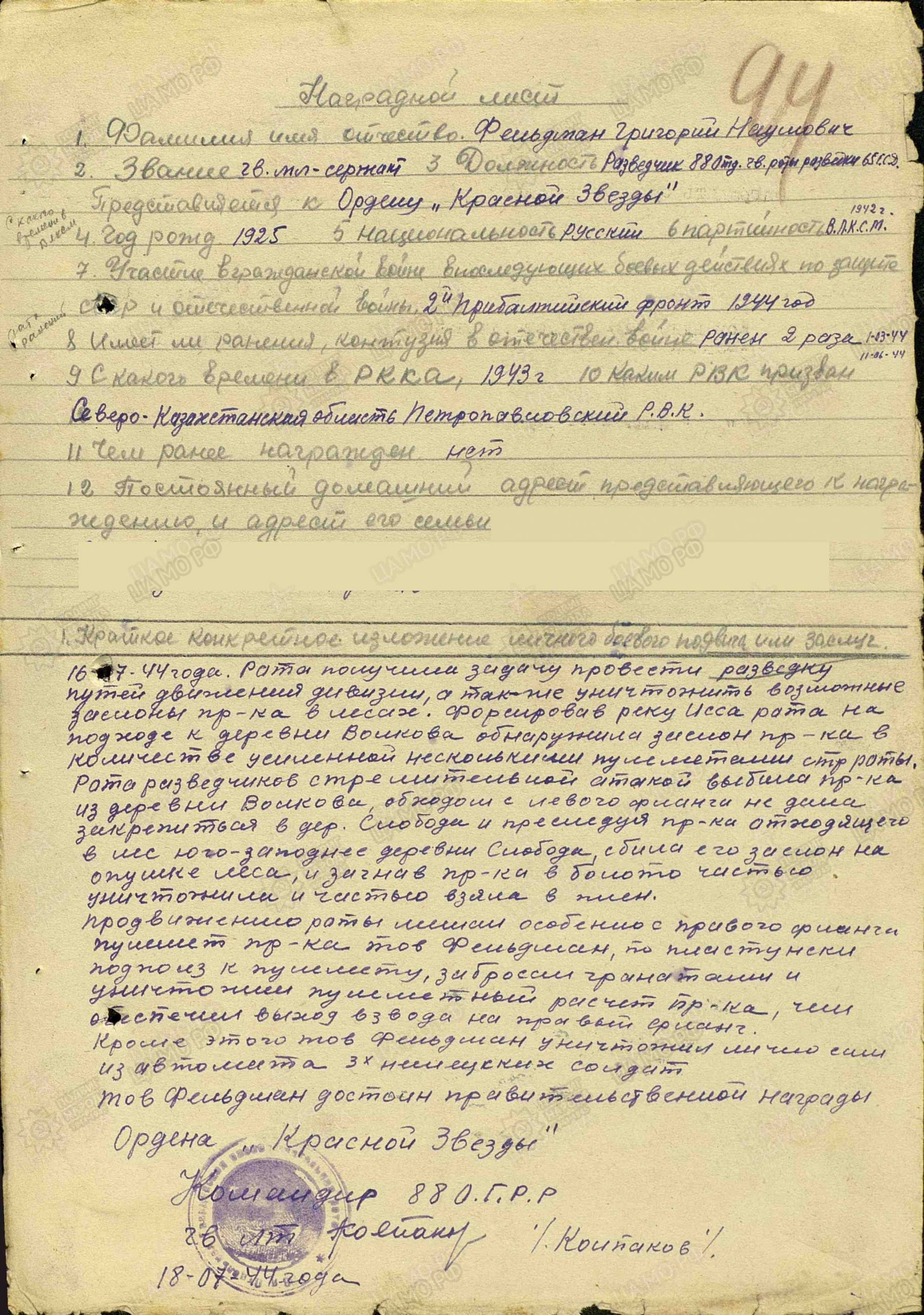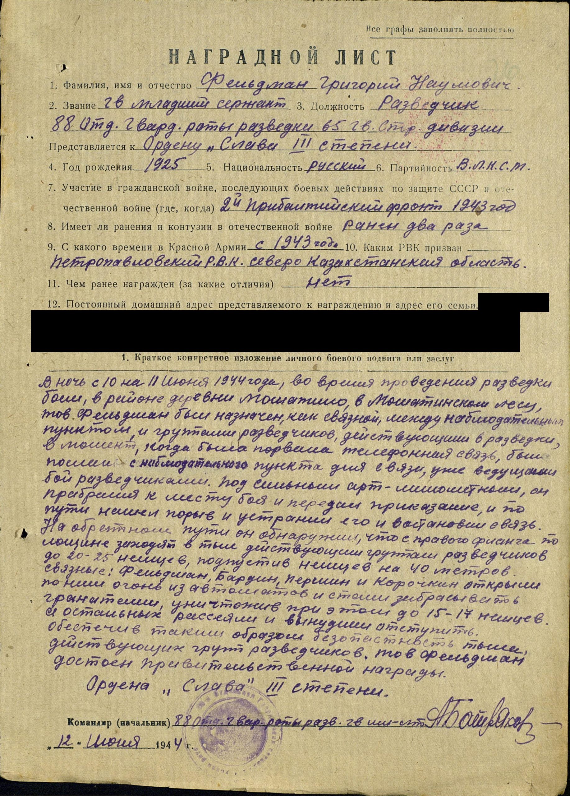 1. ” ב- 1944.07.16 הגדוד קיבל פקודה לאסוף מודיעין בשטח האויב ולהשמיד את המארבים של האויב ביערות. אחרי שעברו את נהר האיסה שליד כפר וולקובה, הם גילו גדוד של גרמנים עם כמה מקלעים, לכן הסיירים תקפו את הגרמנים, הכריחו אותם לצאת מכפר וולקובה ולא נתנו להם להיכנס לסלובודי. הסיירים רדפו אחרי האויב שניסה לברוח לכיוון היערות ותוך כדי הקרב הם השמידו חלק מהגרמנים ואת חלקם לקחו בשבי. מספר גרמנים שהיו ממוקמים עם מקלע היוו איום לגדוד. גרגורי פלדמן זחל לעבר הגרמנים, זרק עליהם רימונים והשמיד את צוות הגרמנים. חוץ מזה, גרגורי השמיד בעצמו עם תת מקלע שלושה חיילים גרמנים.”