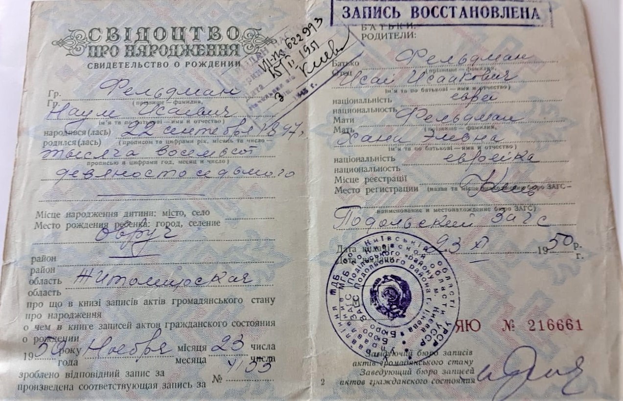 מבקש בעתירתי לא לסרב, מפני שאין לי כל מידע על קרובי משפחתי מתחילת המלחמה. אני עצמי סיימתי את בית הספר התיכון מס’ 7 במאזיר, ואחר כך למדתי שלוש שנים במוסקבה ומראשית המלחמה נשלחתי אל עורף האויב בהרכב צנחנים. כעת אני נמצא בשירות צבאי פעיל. את ההודעה שילחו לכתובת: דואר שדה 02984-י, עבור פלדמן איליה בן נאום.