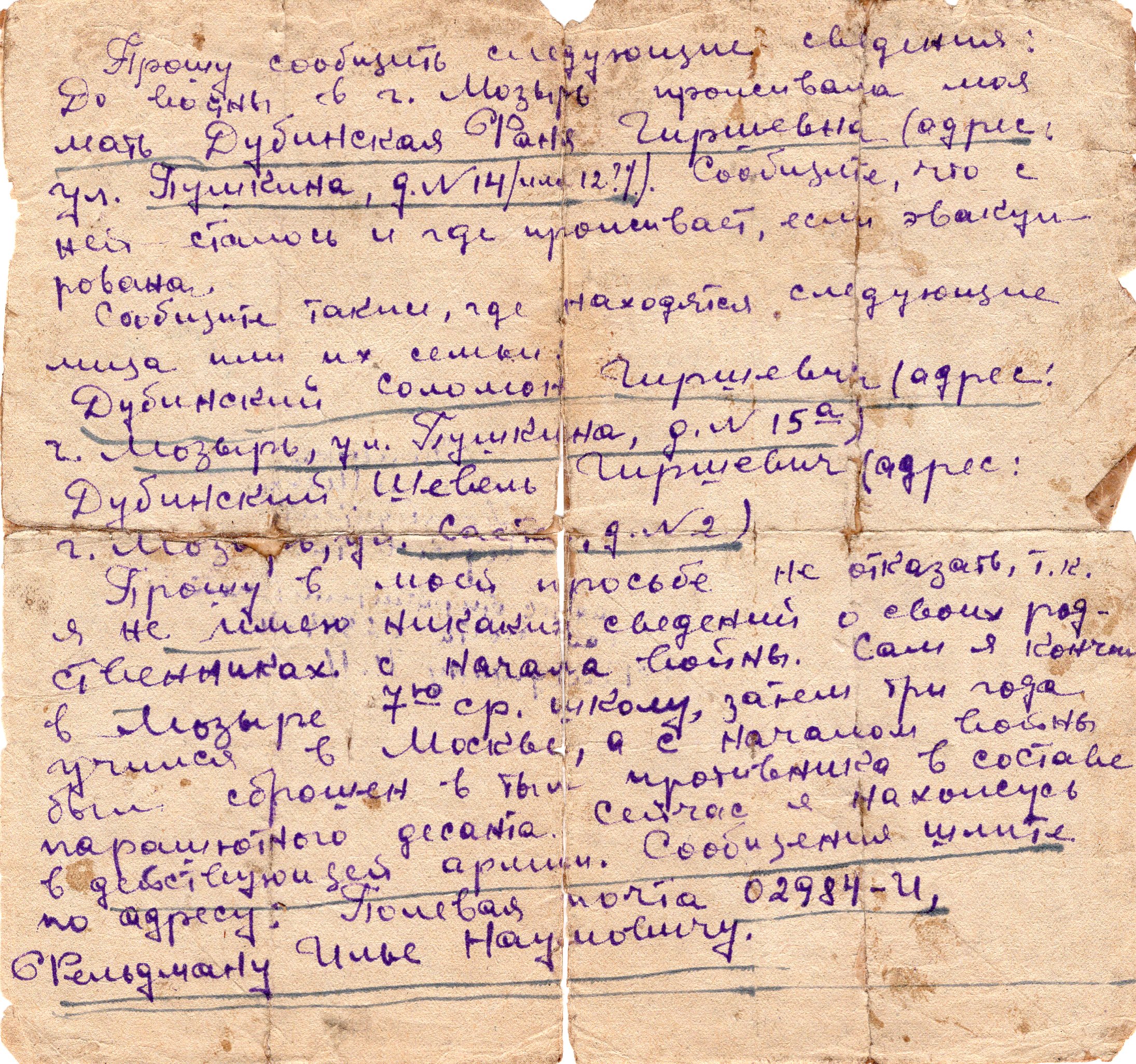 Прошу в моей просьбе не отказать, т.к. я не имею никаких сведений о своих родственниках с начала войны. Сам я кончил в Мозыре 7-ю ср. Школу, затем три года учился в Москве, а с началом войны был сброшен в тыл противника в составе парашютного десанта. Сейчас я нахожусь в действующей армии. Сообщения шлите по адресу: Полевая почта 02984-и, Фельдману Илье Наумовичу.