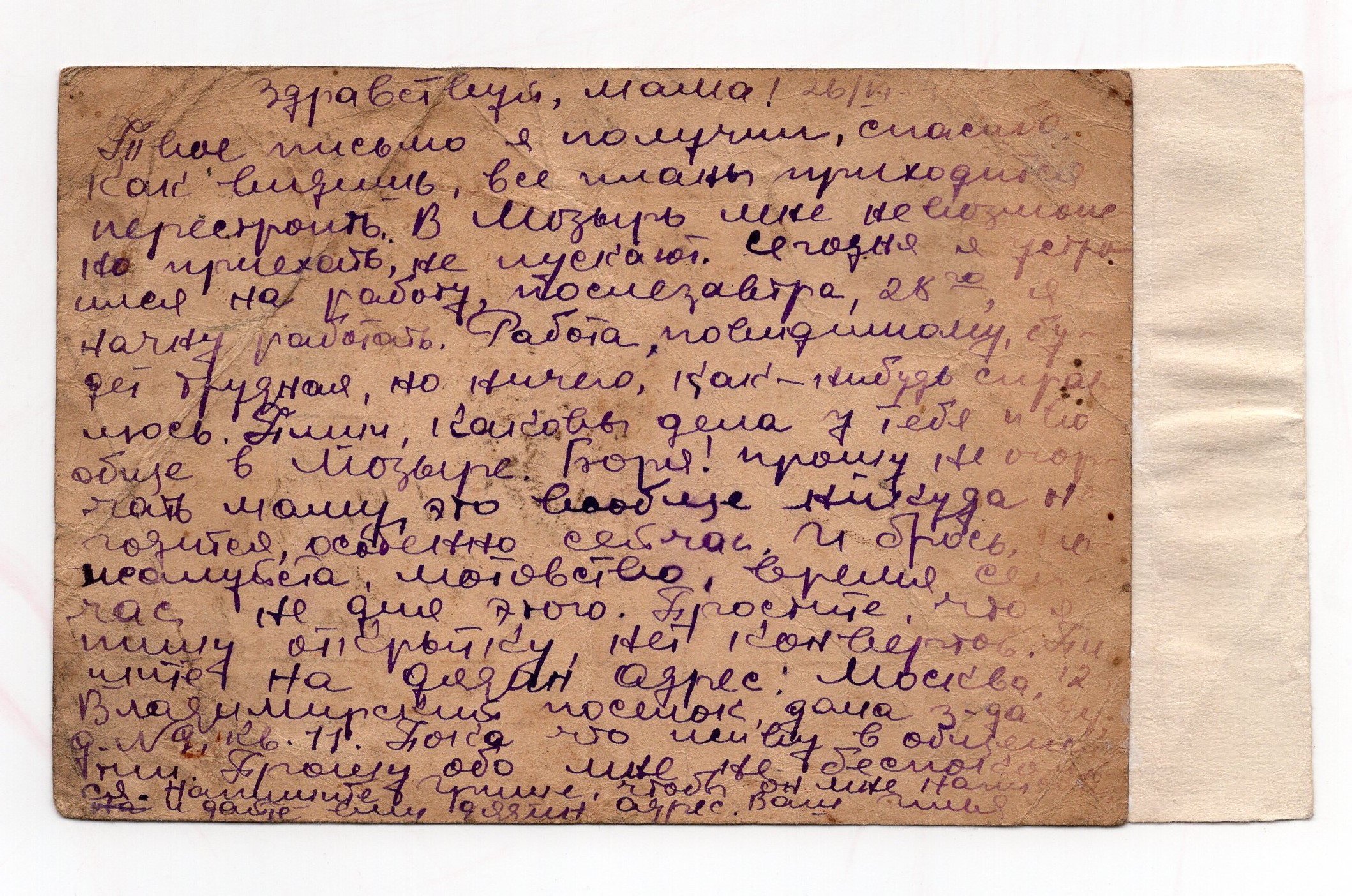 Как видишь, все планы приходится перестроить. В Мозырь мне не возможно приехать, не пускают. Сегодня я устроился на работу, послезавтра, 28го, я начну работать. Работа, по видимому будет трудная, но ничего, как-нибудь справлюсь. Пиши, каковы дела у тебя и вообще в Мозыре. Боря! Прошу не огорчать маму, это вообще никуда не годится, особенно сейчас, и брось, ?, мотовство, время сейчас не для этого. Простите, что я пишу открытку, нет конвертов. Пишите на дядин адрес: Москва, 12 Владимирский поселок, дома 3-да, 94[?], д.№9, кв.11. Пока что живу в общежитии. Прошу обо мне не беспокоится. Напишите Грише, чтобы он мне написал и дайте ему дядин адрес. Ваш Илья.