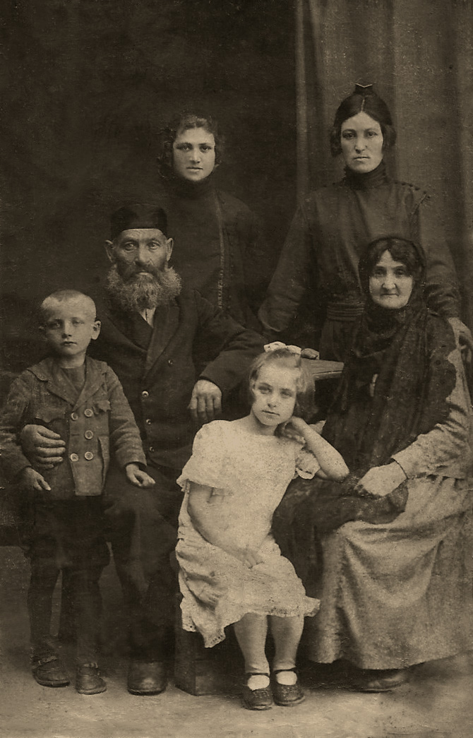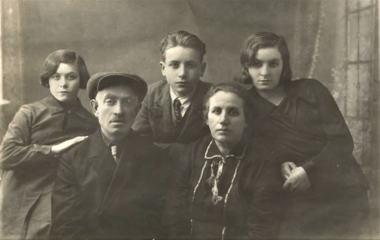 יצחק-צבי ואישת שיינדל יחד עם ילדיהם, עומדים מימין לשמאל לפי גילם, מהגדול אל הקטן: גיטל, בוריס וחיה.